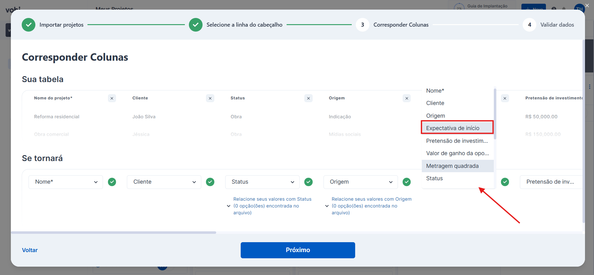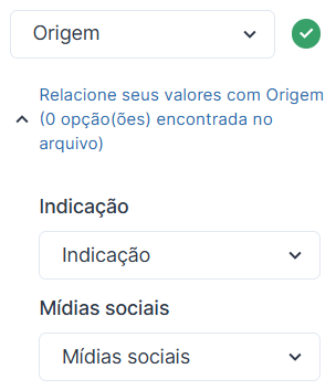Em algumas colunas, como a de origem, pode haver submenus com opções como Mídias Sociais, Google, Orgânico, etc. Fique atento para garantir que todos os dados sejam corretamente correspondidos.