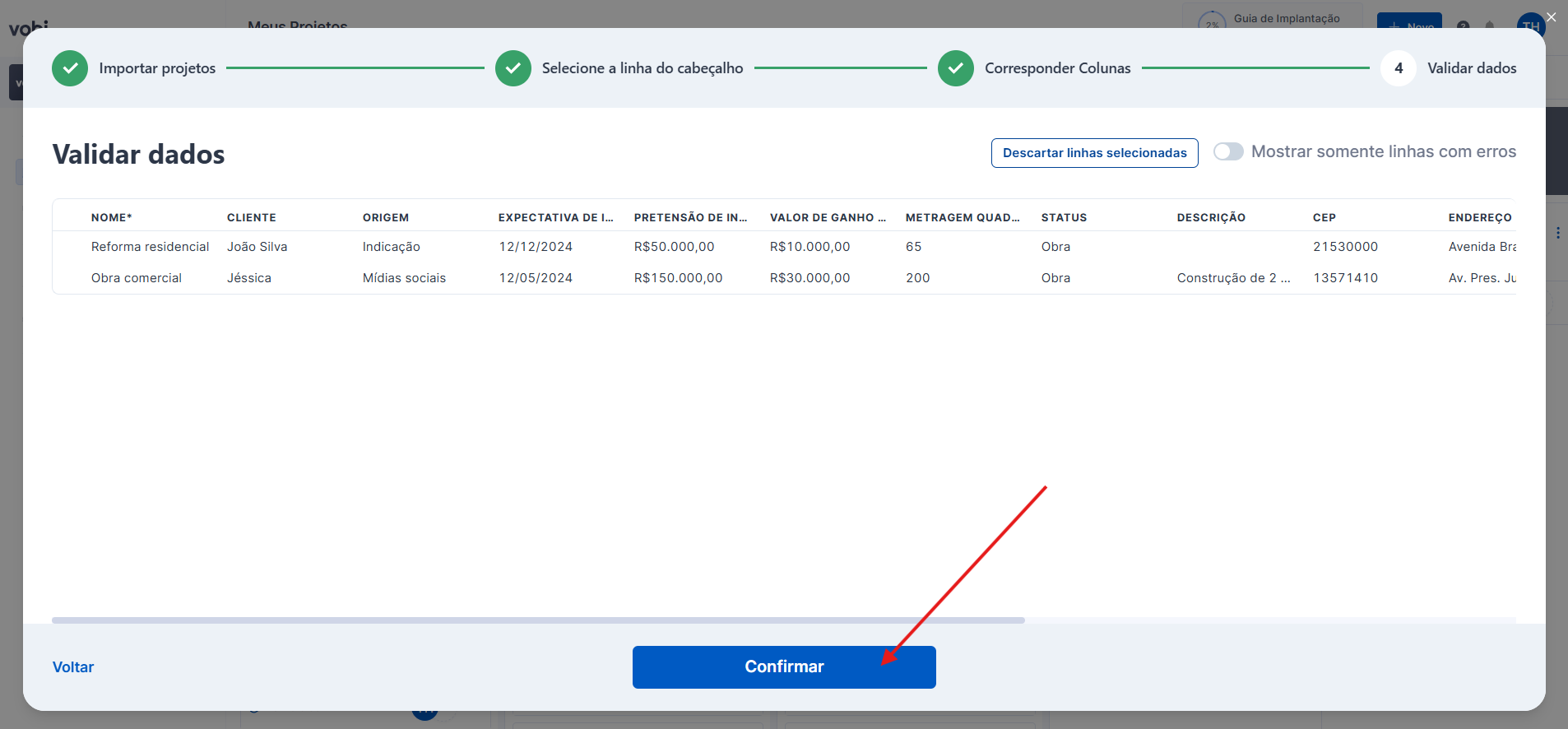 Após revisar todas as correspondências, a plataforma mostrará uma última pré-visualização. Verifique se tudo está correto. Se houver algum erro, você poderá identificar e corrigir apenas as linhas com problemas, que ficam destacadas em vermelho.
