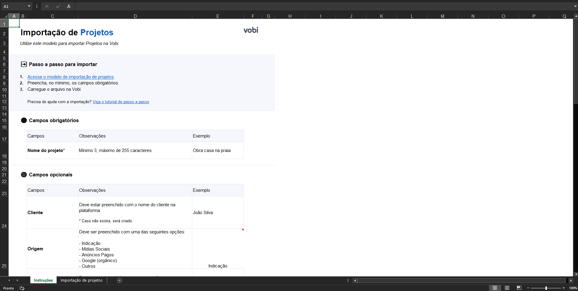 Aba 1: Instruções – Aqui, você encontrará as orientações para garantir que a importação aconteça sem erros. Por exemplo, o nome do projeto deve ter, no mínimo, 3 caracteres para ser aceito.