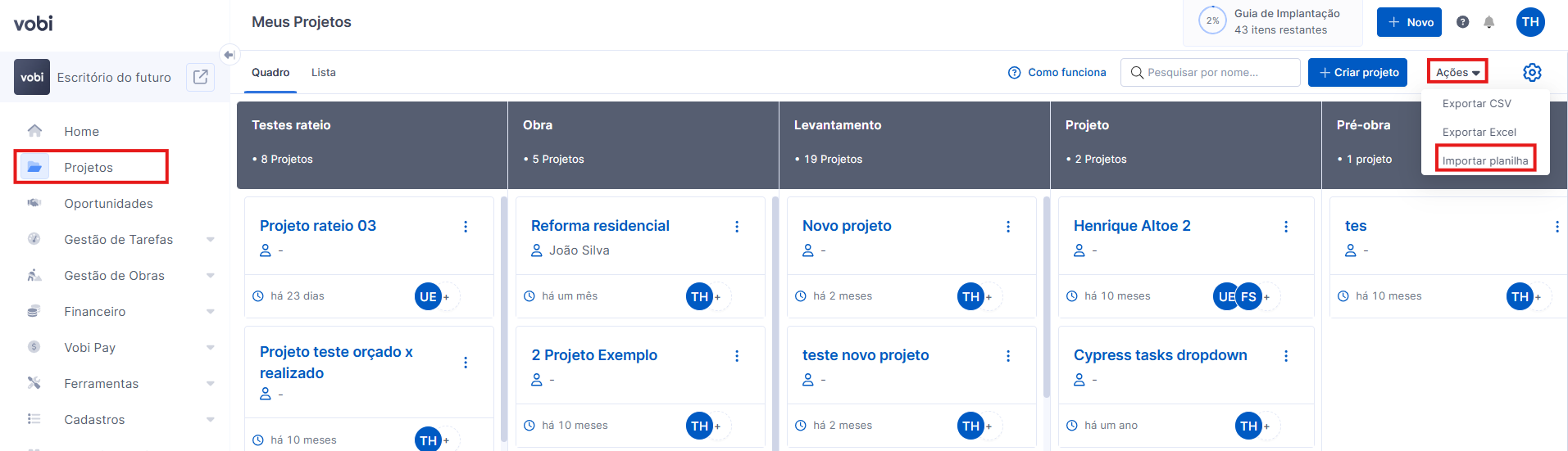 Pronto! A plataforma começará a importar todos os projetos, atribuindo automaticamente o status de cada um e até mesmo os responsáveis por eles.