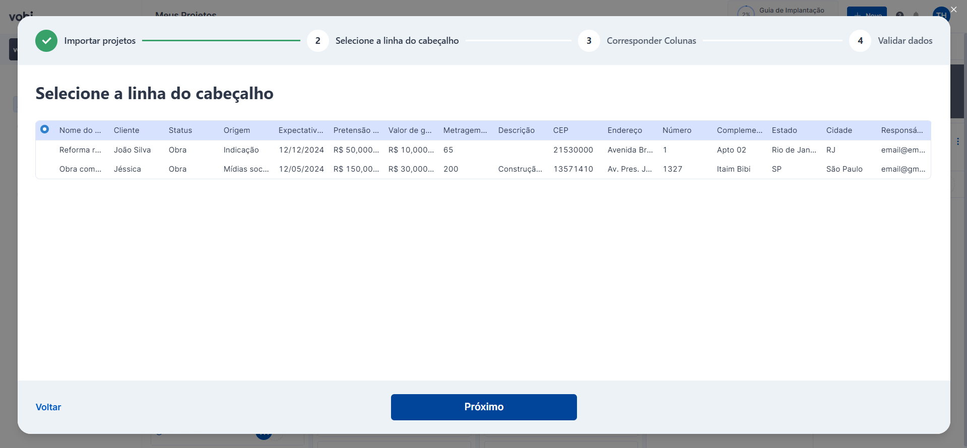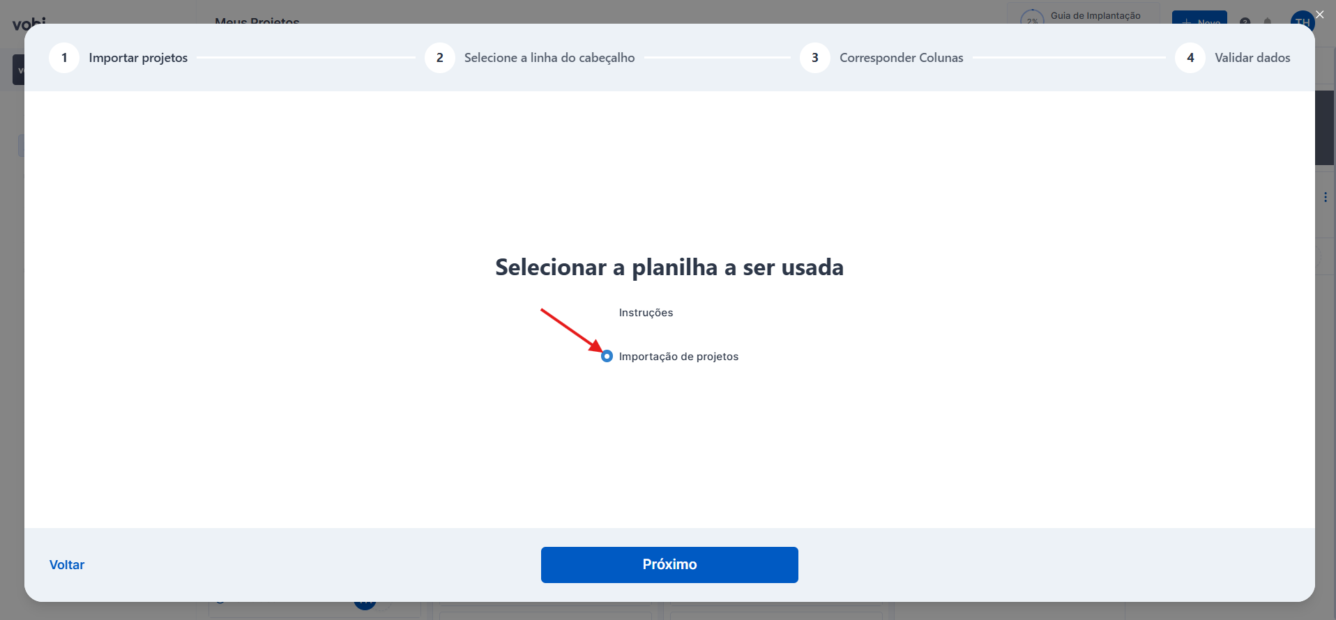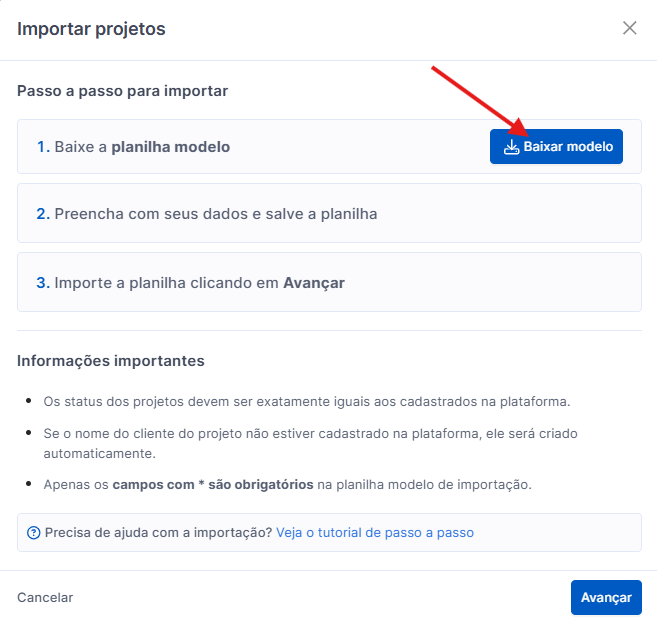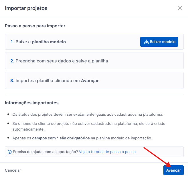 Para fazer a importação da sua planilha para a plataforma, vá até o menu de Projetos e, no mesmo local onde fez o download do modelo de importação, clique na opção Avançar. Selecione o arquivo que você acabou de baixar e siga o passo a passo a seguir.