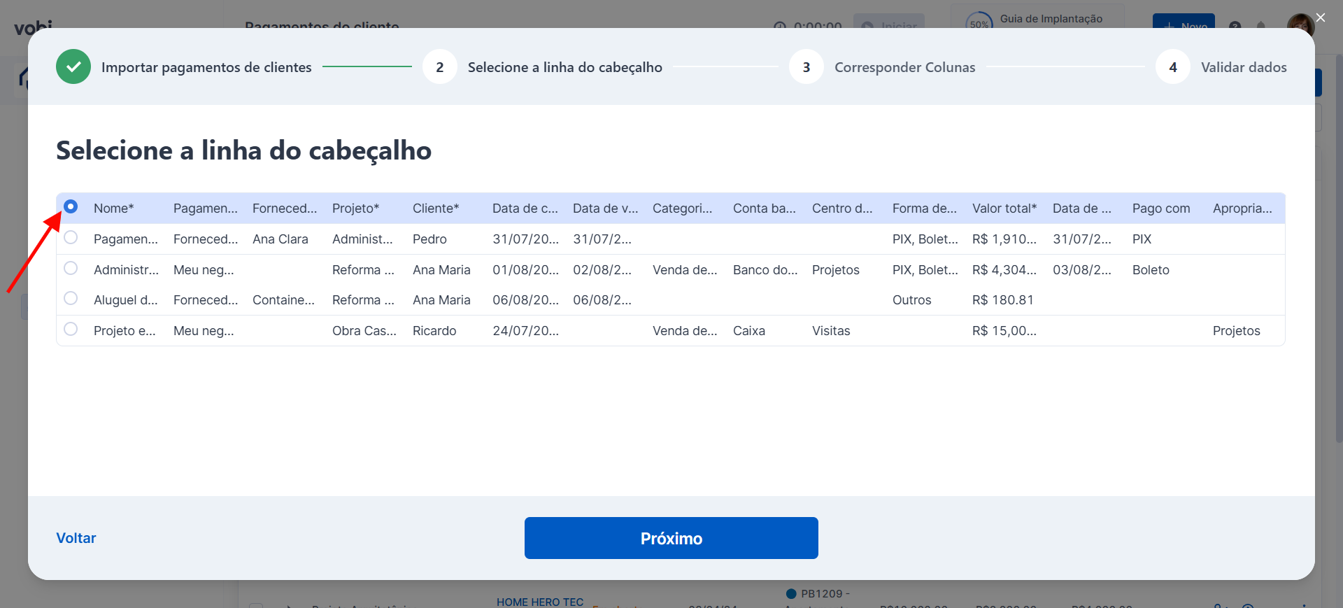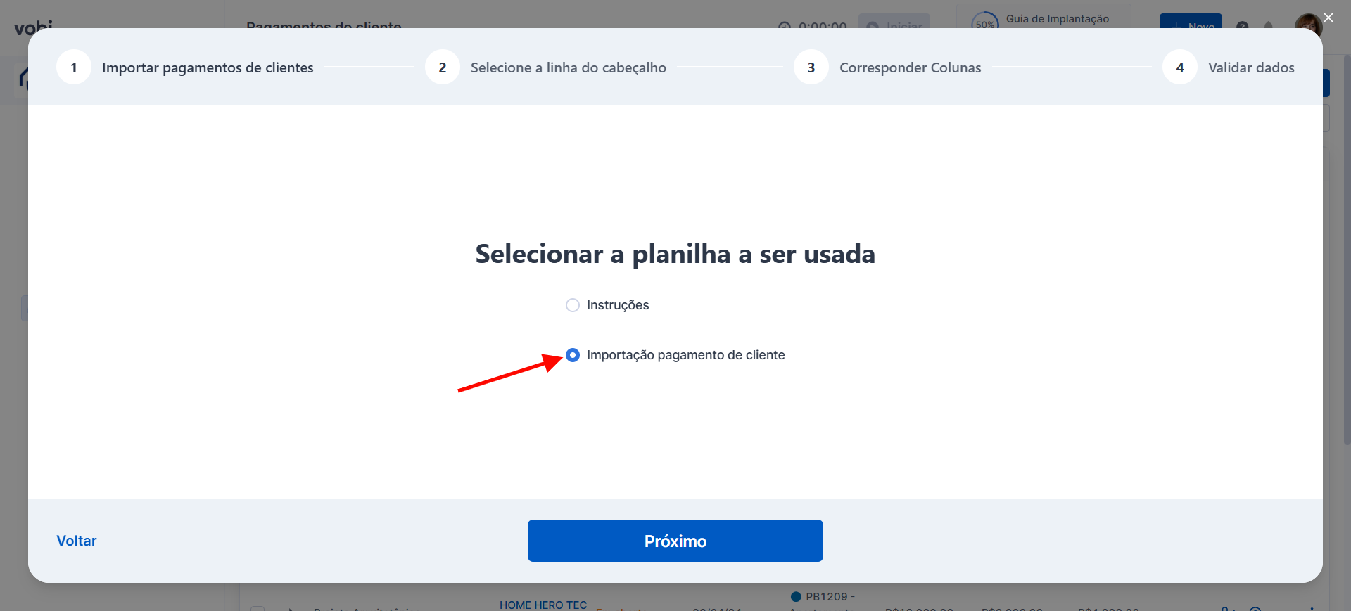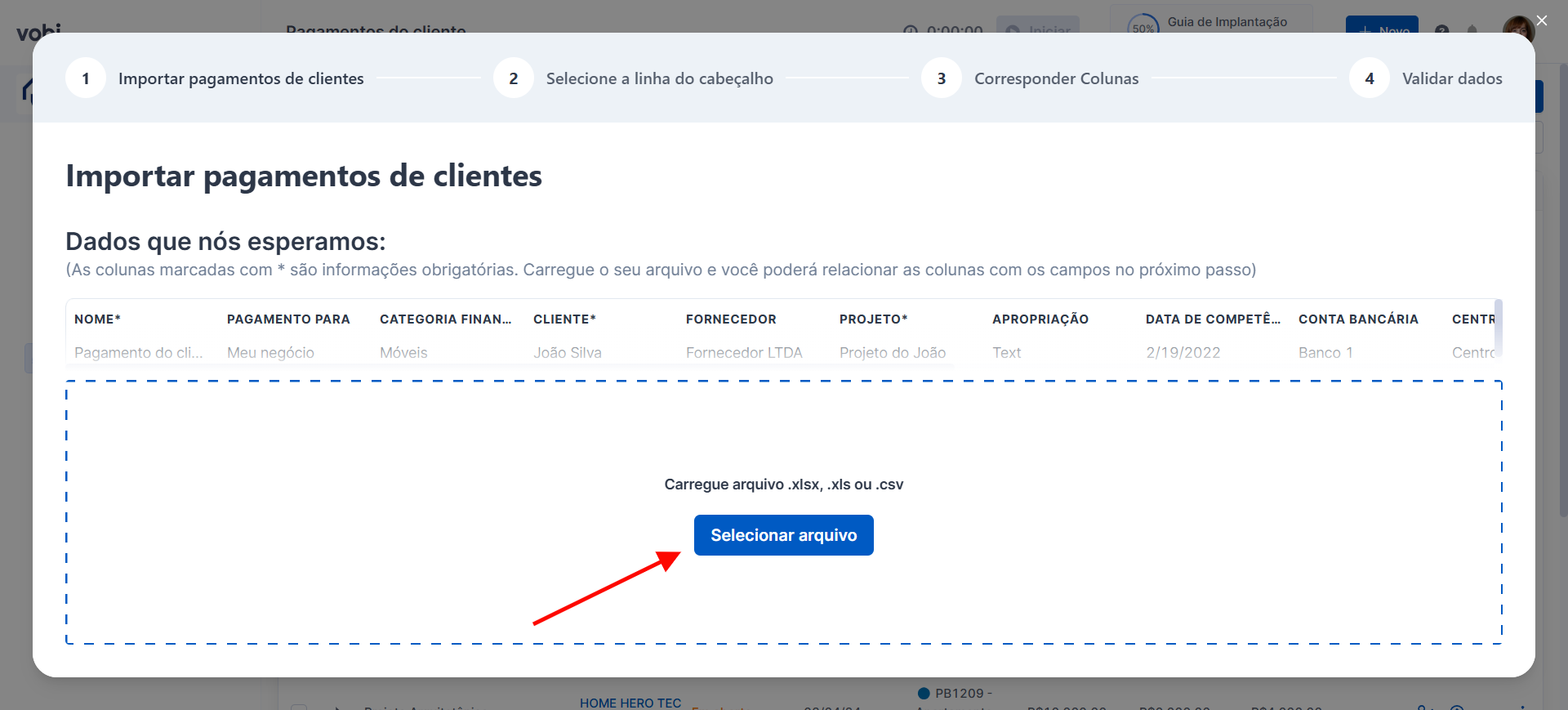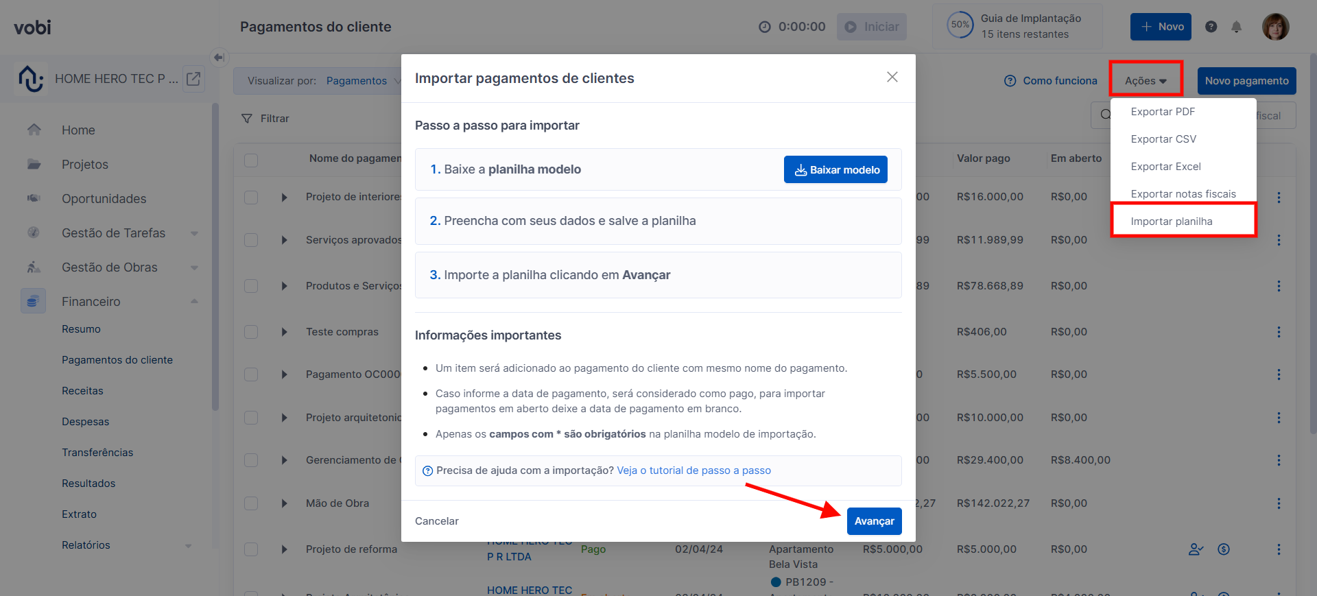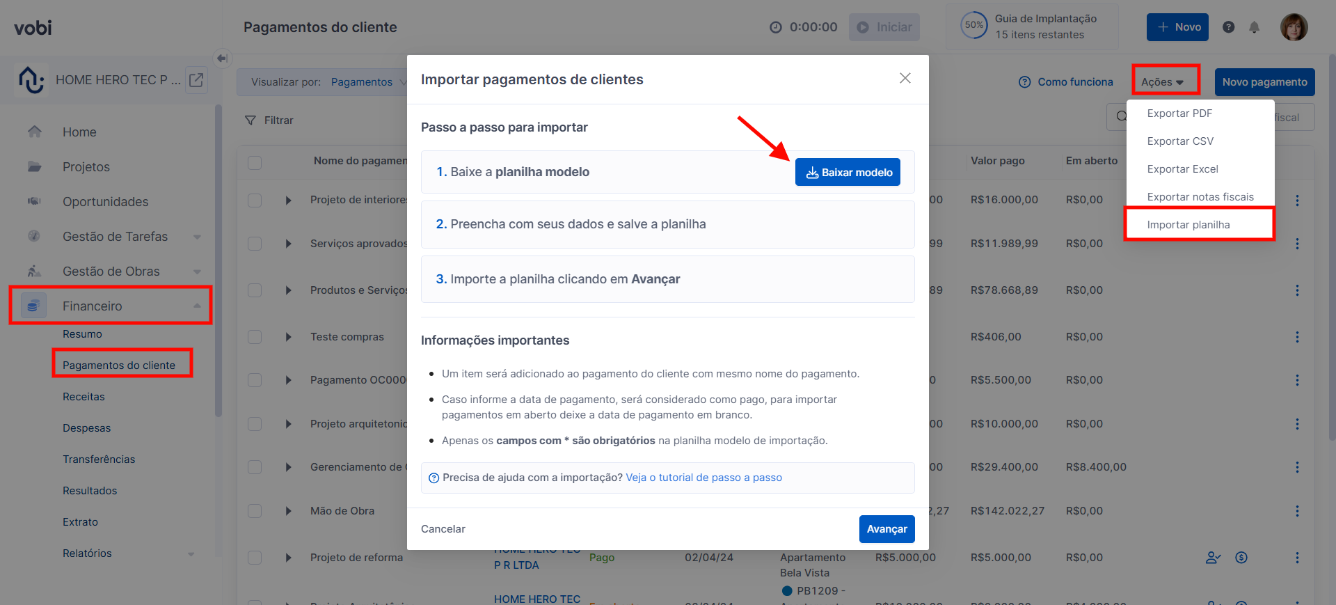 Na Vobi, é possível importar pagamentos de clientes diretamente para o sistema por meio de uma planilha modelo. Essa funcionalidade permite agilizar o processo de migração dos seus projetos em andamento e de importação de histórico de dados