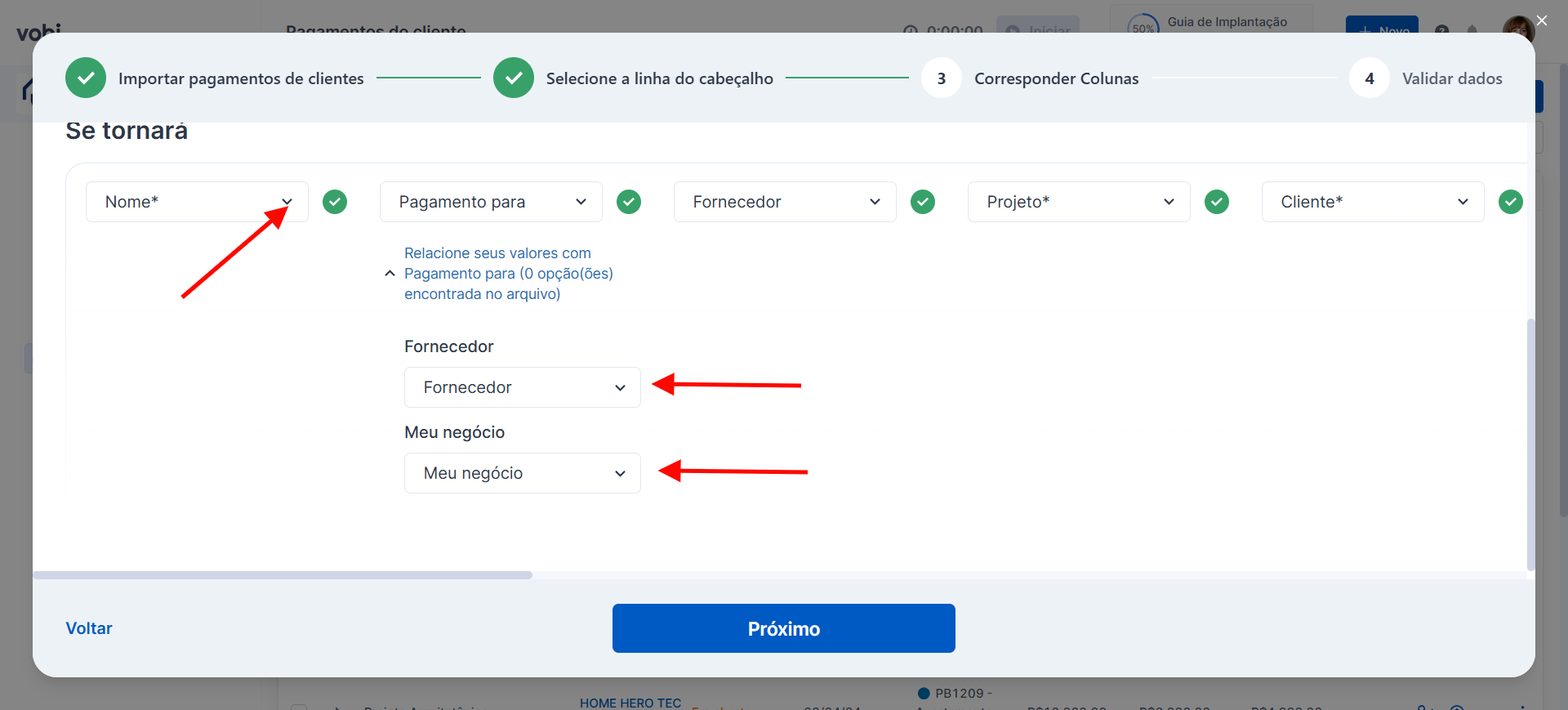 No próximo passo, o sistema vai identificar automaticamente as colunas relacionadas ao dado que está sendo importado, ou seja, você vai corresponder as colunas! Nesse passo é muito importante que você verifique o relacionamento de valores.
