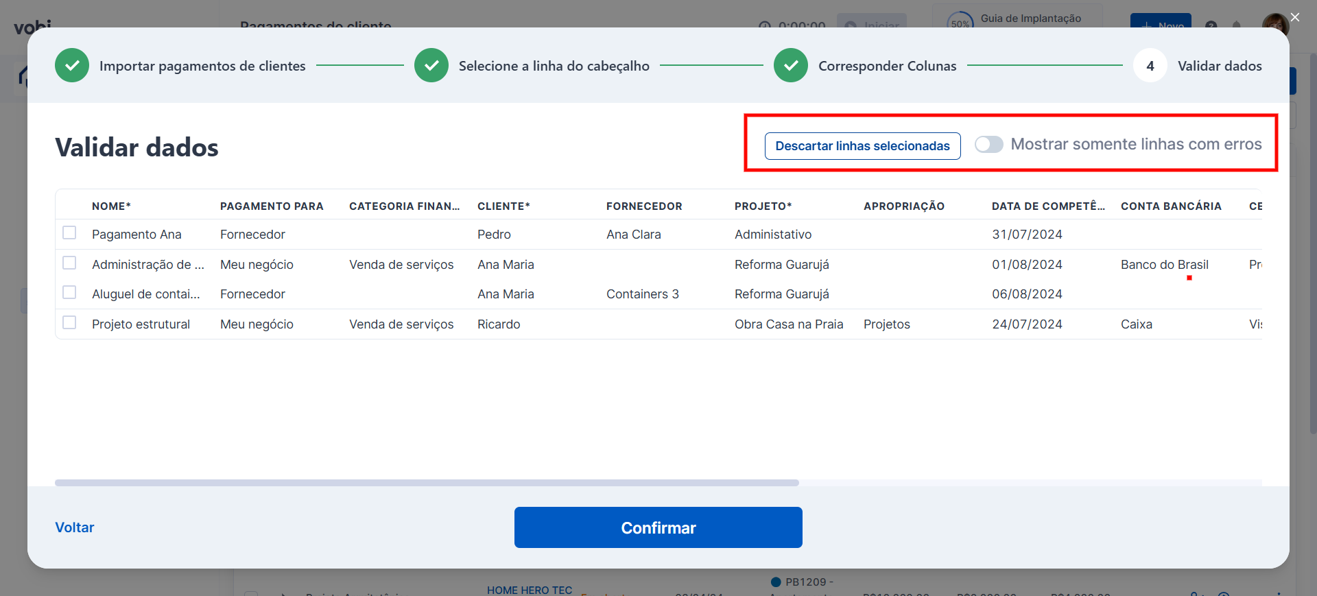 Na validação de dados, você identificará se algum erro aconteceu na sua planilha! Através de Mostrar somente linhas com erros, você visualiza somente o que tem erro e pode corrigir ou então descartar linhas selecionadas através do ícone acima. Após correção, clique em Confirmar.