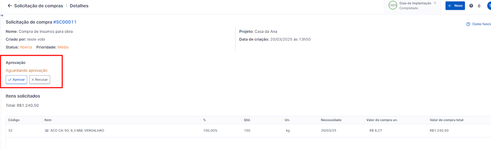 Para usuários com permissão de aprovação, avançar o status de uma solicitação ou OC resulta em aprovação automática.
