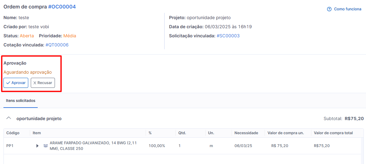 Nas telas de visualização de uma ordem de compra, usuários com permissão de aprovação verão botões para aprovar ou recusar a solicitação, localizados abaixo do cabeçalho.