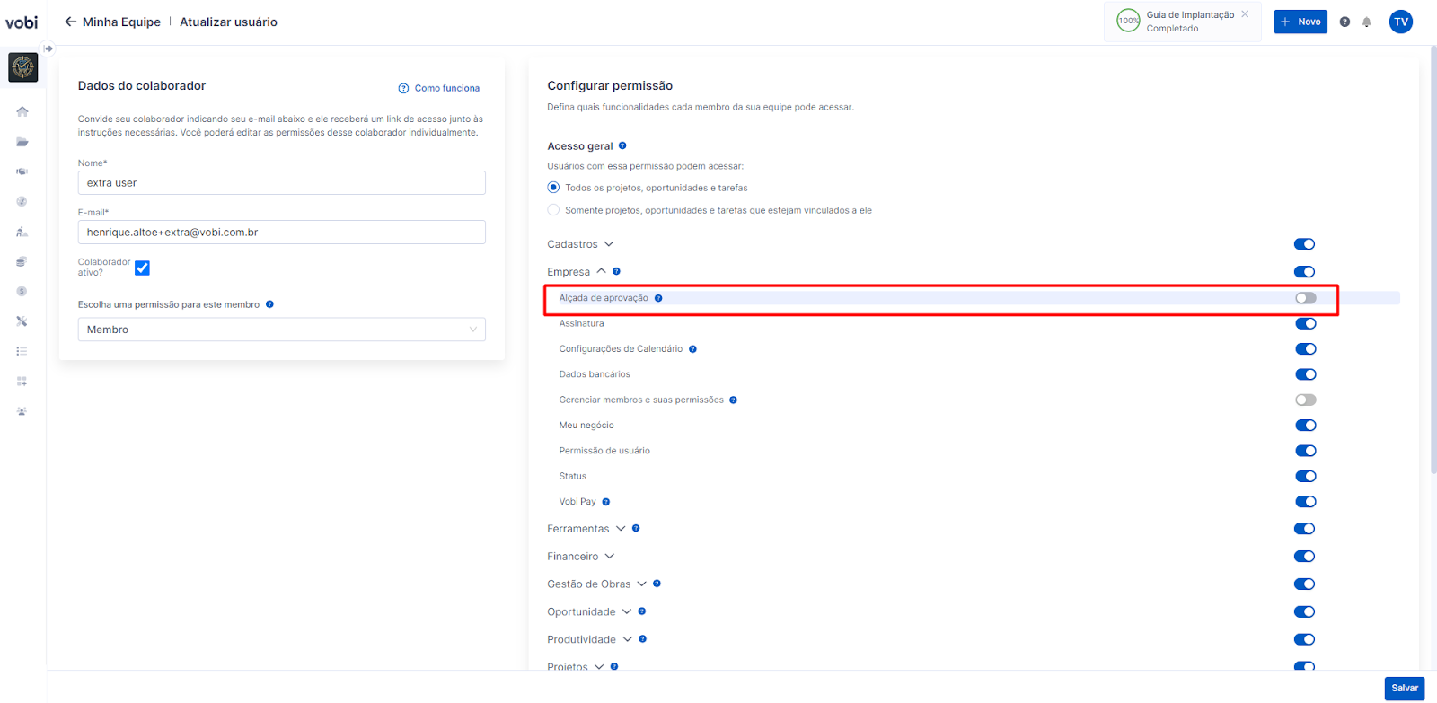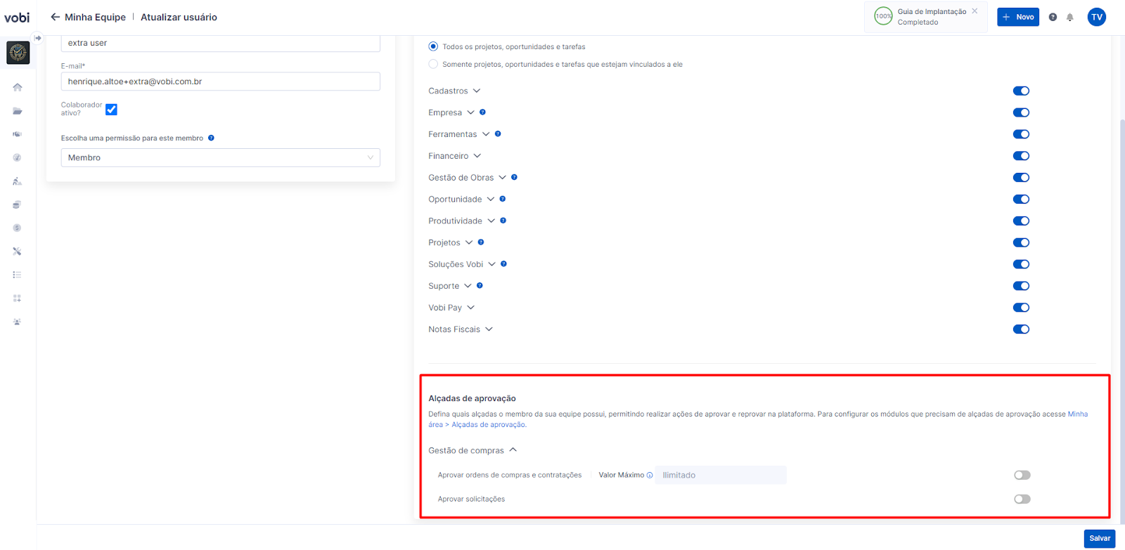 Ao criar ou editar um usuário na Vobi, há uma seção específica para configurar sua alçada de aprovação. É possível definir alçadas tanto para solicitações quanto para ordens de compra. Usuários com perfil de administrador (admin) ou proprietário possuem, por padrão, todas as alçadas ativas e ilimitadas.