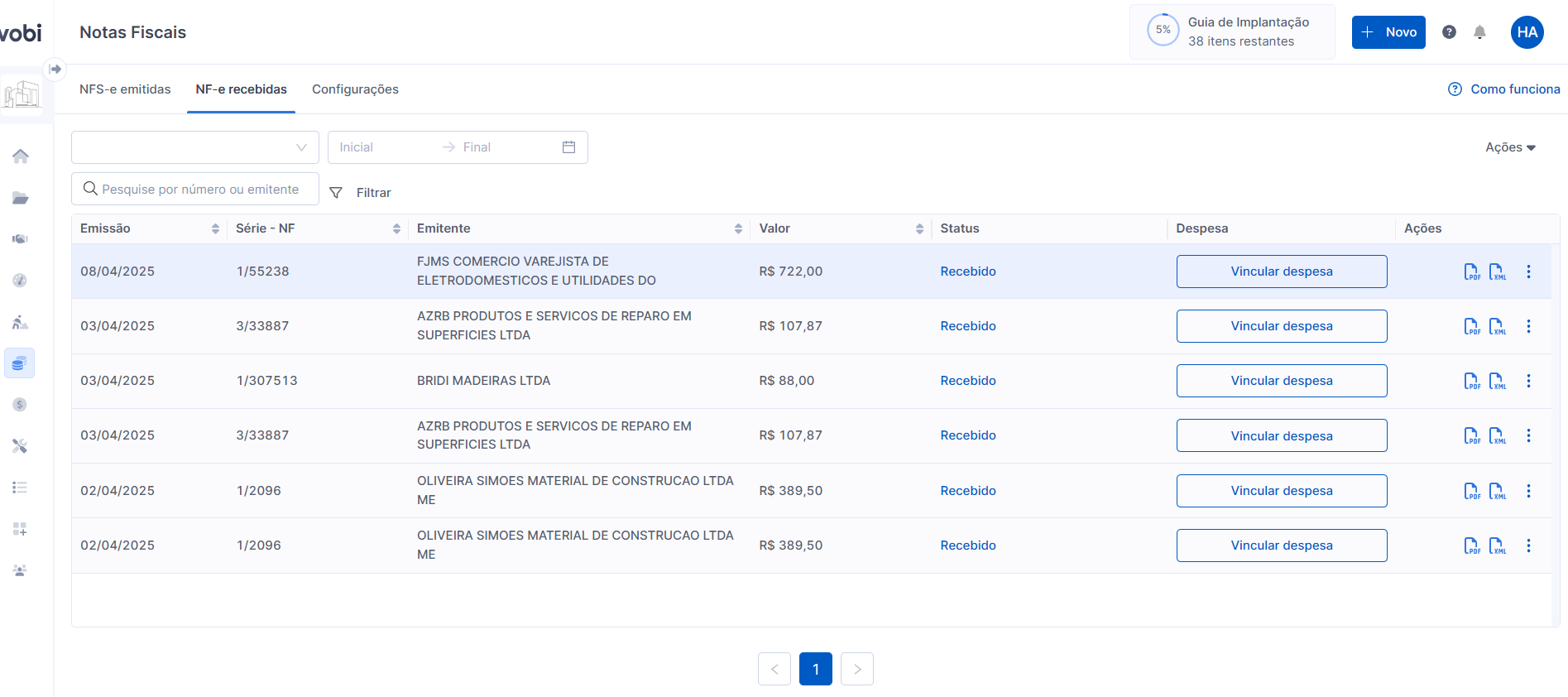 Dica Vobi: Garanta que todas as notas possuem uma despesa vinculada para ter seu controle financeiro completo.