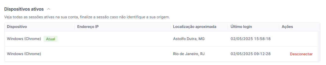 Se identificar algum acesso desconhecido, você poderá encerrar a sessão imediatamente utilizando o botão Desconectar.