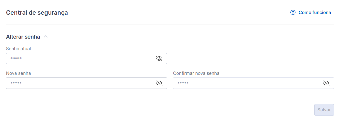 Para alterar a senha basta ir até a central de segurança e preencher os campos conforme indicado: