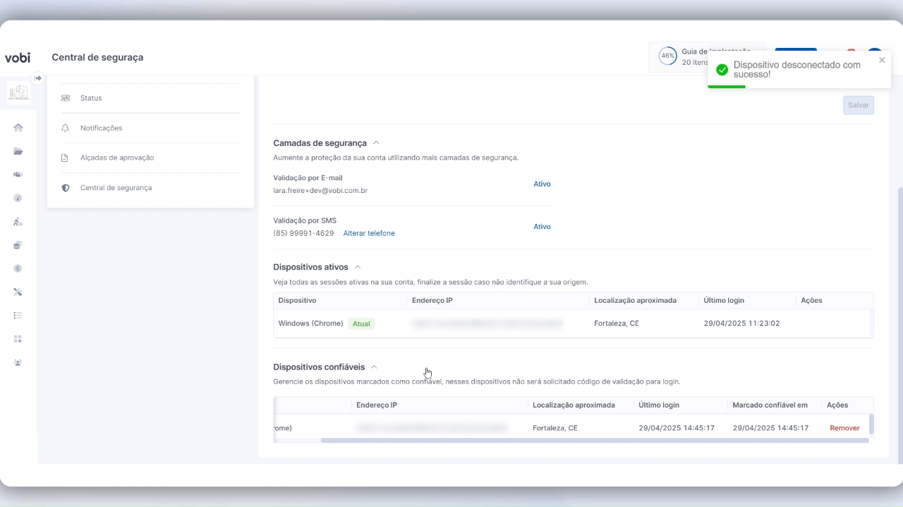 Para tornar sua experiência mais prática sem comprometer a segurança, a Vobi permite definir dispositivos como confiáveis. Essa funcionalidade é ideal para acessos recorrentes em dispositivos de uso pessoal, evitando a necessidade de verificar sua identidade a cada login.
