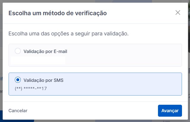 Em seguida, serão exibidas as opções disponíveis, e você poderá selecionar o envio do código via SMS.
