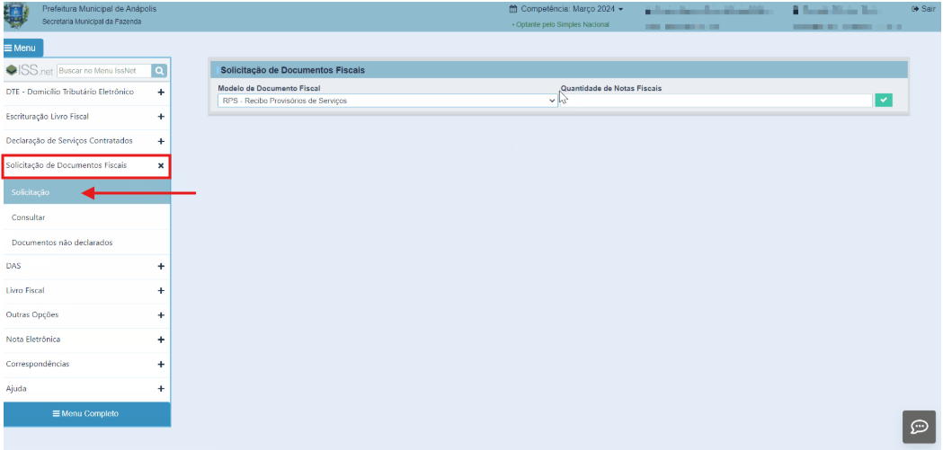 A emissão de NFS-e pela Vobi será possível apenas com um número de RPS liberado no portal da prefeitura. E para solicitar essa liberação, acesse o portal da prefeitura e vá na opção Solicitação de Documentos Fiscais > Solicitar e insira a quantidade de RPS a ser solicitado.