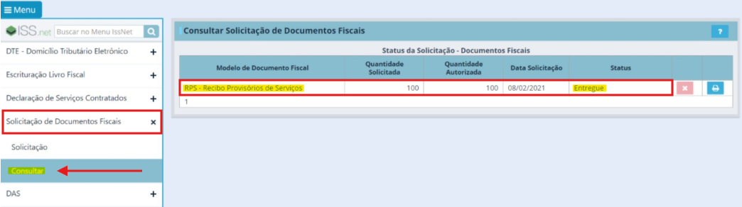 Para verificar se já foi liberado acesse a prefeitura, clique em Solicitação de documentos fiscais > Consultar.