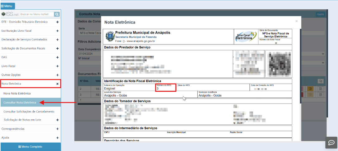 Para encontrar a sua última nota fiscal emitida no portal da prefeitura, clique em Nota Eletrônica > Consultar nota eletrônica, e encontre a nota mais recente. Acesse a impressão dessa nota fiscal e o último Número de RPS utilizado estará no cabeçalho.