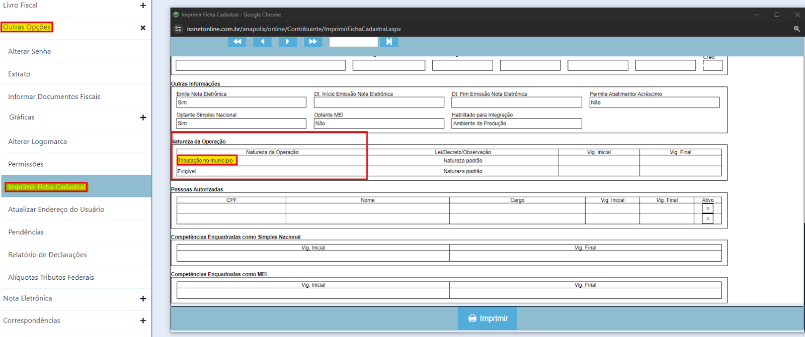 Este campo indica quem é o responsável pelo recolhimento do ISS (Imposto Sobre Serviços). Essa informação pode ser encontrada na sua última nota fiscal emitida ou no portal da prefeitura, em Outras Opções > Imprimir Ficha Cadastral.