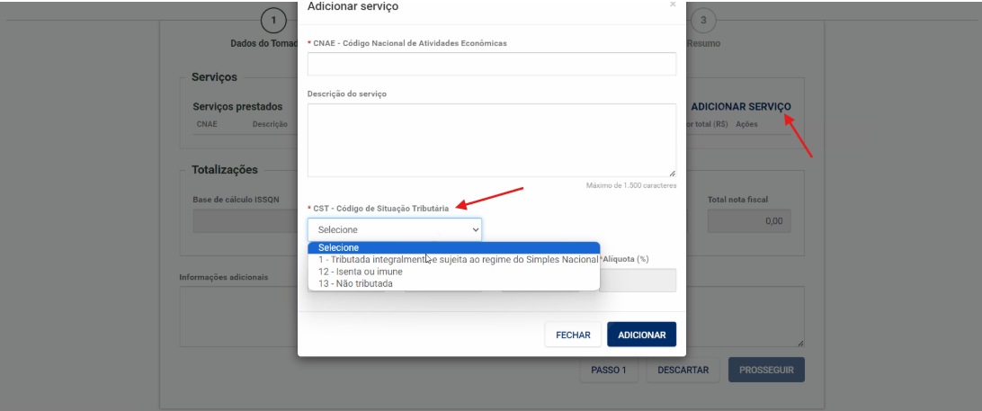 No portal da prefeitura de emissão de NFS-e, ao simular uma nota, o sistema pode sugerir automaticamente o CST conforme a sua escolha de serviço e regime tributário.