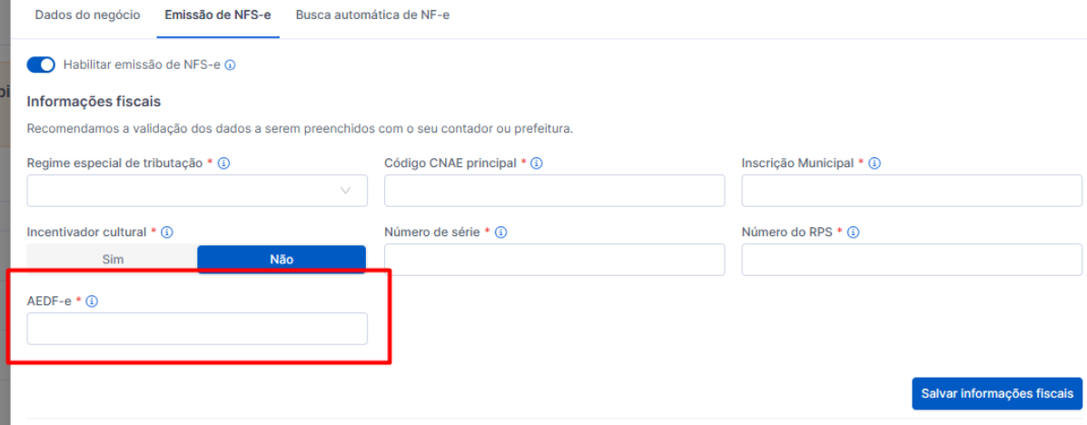 Depois de inserir os Dados do Negócio, clique em Cadastrar e o passo seguinte será configurar a Emissão de NFS-e. Nessa parte, será necessário preencher as informações fiscais da sua empresa e vamos te ajudar a encontrar cada uma desses dados.