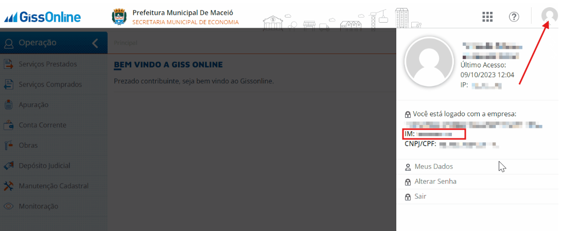 Dentro do portal da prefeitura, após realizar o login, clique no ícone de Perfil para encontrar o número da inscrição municipal.