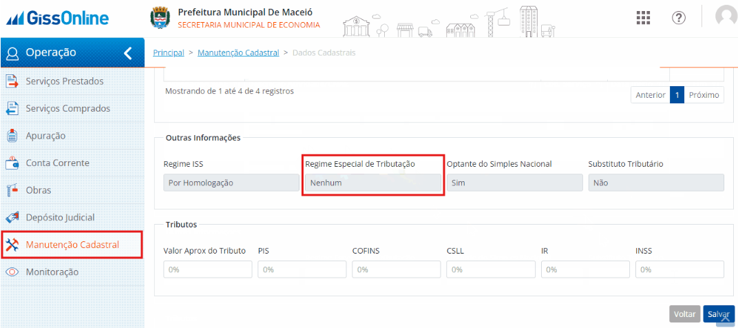 No portal da prefeitura, você encontra essa informação no menu lateral direito, em Manutenção Cadastral > Dados Cadastrais, clique em Outras Informações, role a página para baixo e encontrará o Regime Especial de Tributação.