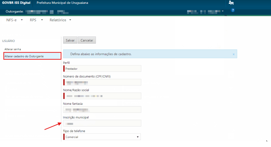Depois em Alterar cadastro do Outorgante e o número estará no respectivo campo de inscrição municipal.