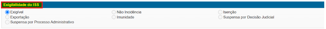 Este campo indica quem é o responsável pelo recolhimento do ISS (Imposto Sobre Serviços). Essa informação pode ser encontrada na sua última nota fiscal emitida ou simule a emissão de uma NFS-e pela prefeitura e você encontrará essa informação no campo Exigibilidade do ISS, pela opção selecionada.