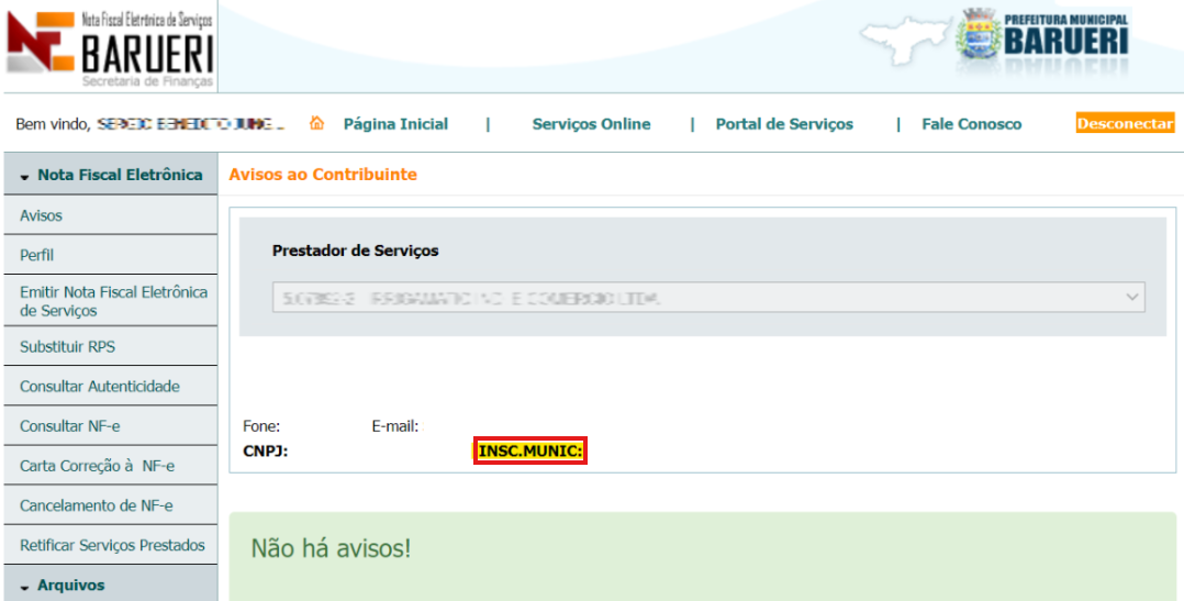 Essa informação pode ser encontrada em uma nota fiscal emitida anteriormente ou dentro do portal da prefeitura, na tela inicial após realizar o login, no campo INSC.MUNIC.