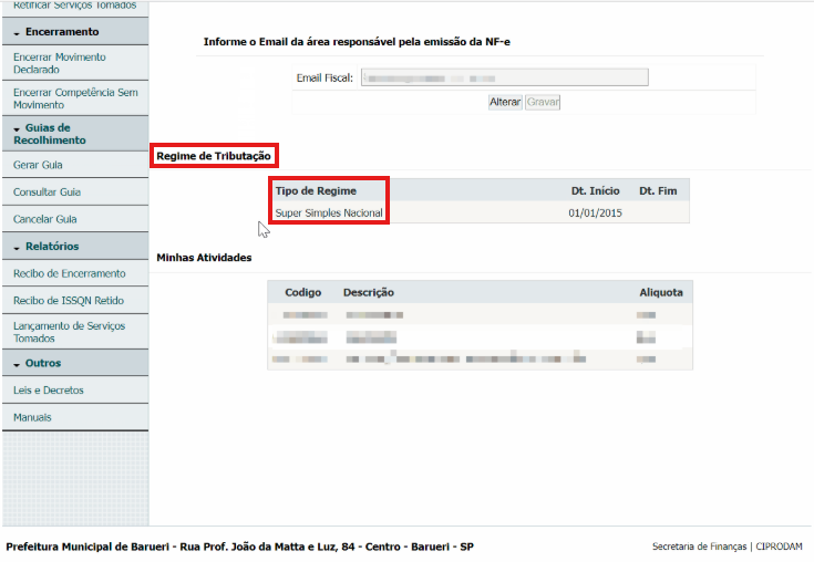 O Regime Especial de Tributação pode ser encontrado no PDF da última nota fiscal emitida, ou pelo portal da prefeitura de sua cidade. No portal prefeitura, clique em Perfil para encontrar o Regime de Tributação no final da tela.