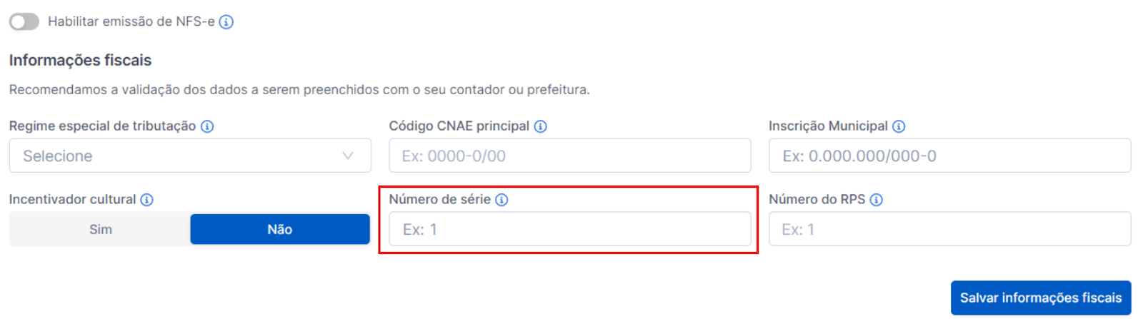 Depois de inserir os Dados do Negócio, clique em Cadastrar e o passo seguinte será configurar a Emissão de NFS-e. Nessa parte, será necessário preencher as informações fiscais da sua empresa e vamos te ajudar a encontrar cada uma desses dados.