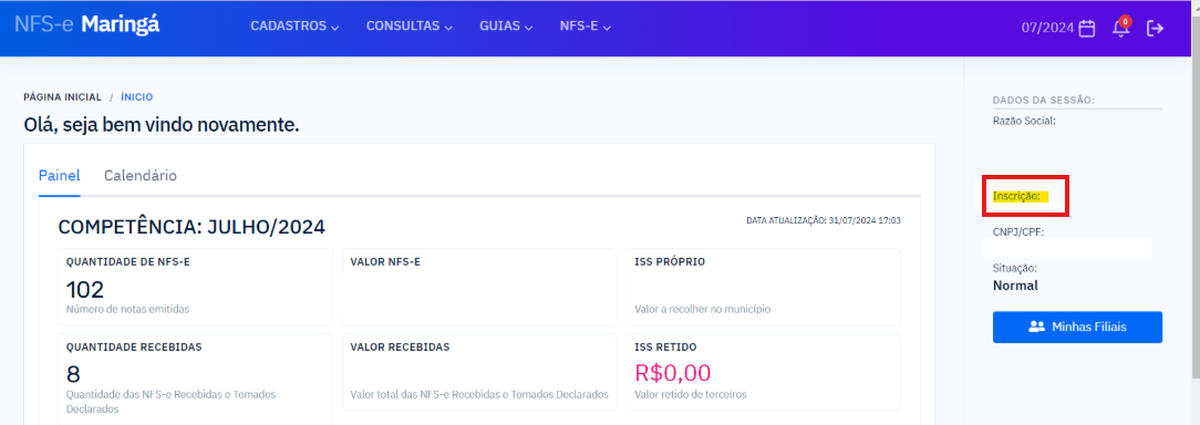 Essa informação pode ser encontrada em uma nota fiscal emitida anteriormente ou dentro do portal da prefeitura, na tela inicial após realizar o login, no canto superior direito.