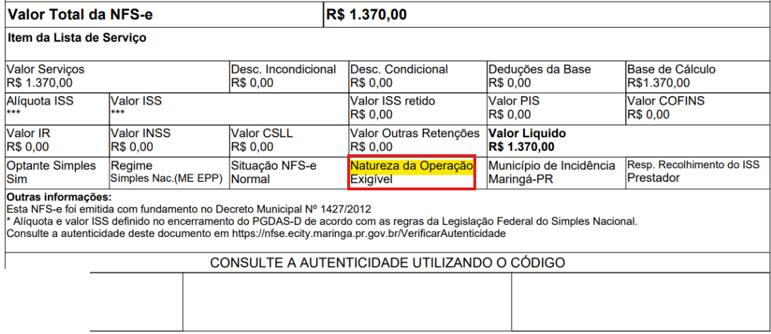Para ver a última nota fiscal emitida da sua empresa dentro do portal da prefeitura, depois de realizar o login siga o caminho: Consultas > Consulta de NF-e > Consultar > Imprimir. A Natureza da operação estará na impressão da NFS-e.