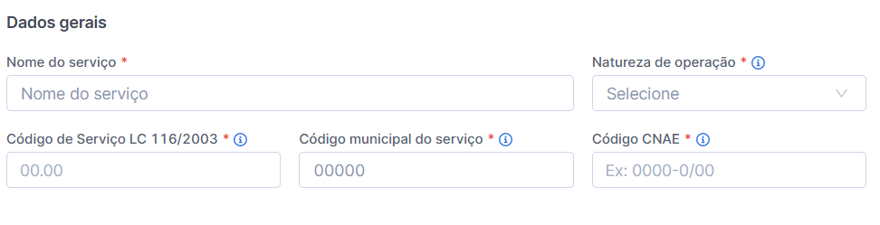 Para inserir os serviços prestados pela sua empresa, basta preencher as informações sobre Dados Gerais dos serviços nos seguintes campos: