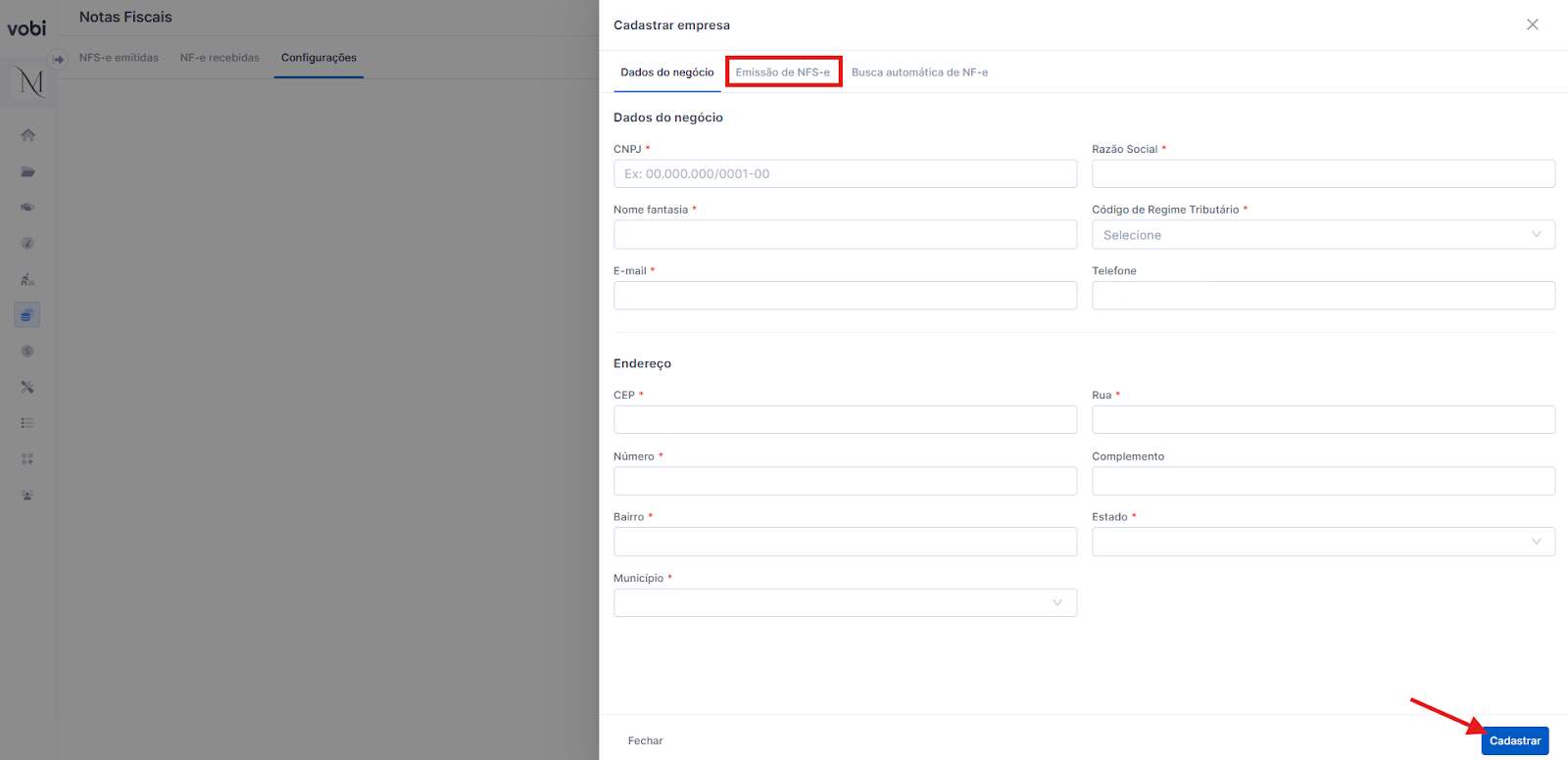 Para fazer o cadastro da sua empresa e começar a emitir notas fiscais de serviço pela Vobi, siga este caminho:
