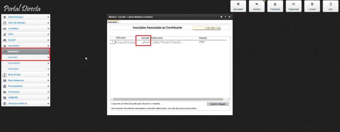 Dentro do portal da prefeitura, após realizar o login, você encontra essa informação em Mobiliário > Consultas > Cadastro Mobiliário Contribuinte, a numeração estará na coluna Inscrição.
