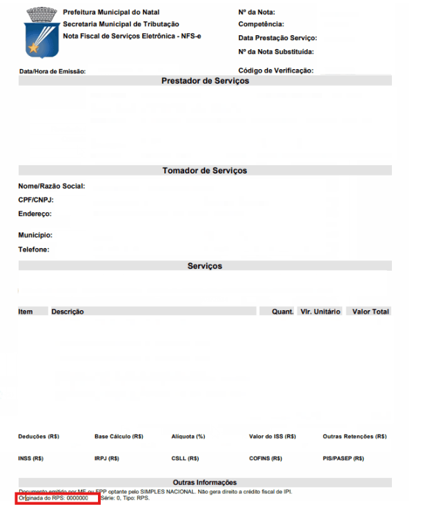 No portal da prefeitura, acesse Nota Natalense > Consultas > Consulta NFS-e. Preencha os filtros necessários e clique em Consultar. Em seguida, selecione uma nota fiscal, clique em Visualizar NFS-e e, ao final do documento, verifique o Número de RPS.