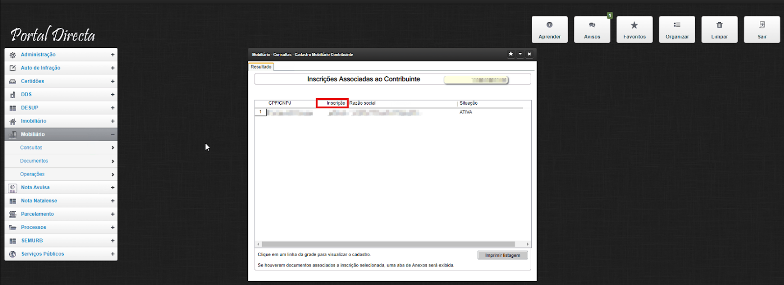 Dentro do portal da prefeitura, após realizar o login, acesse Mobiliário > Consultas > Cadastro Mobiliário Contribuinte. Na tela que abrir, você encontra a Inscrição Municipal na coluna Inscrição.
