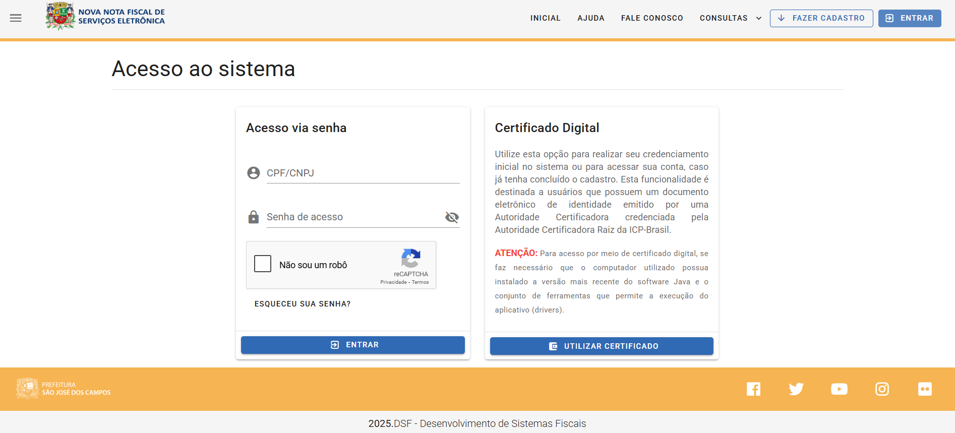 Na cidade de São José dos Campos, o padrão de NFS-e que atende ao município é a DSF 2.0. No momento do cadastro da sua empresa para emissão de notas fiscais na Vobi, você irá encontrar as principais informações que precisa preencher diretamente no portal da Prefeitura.