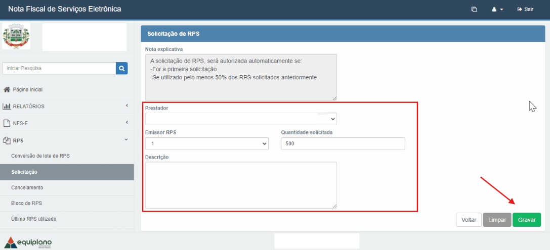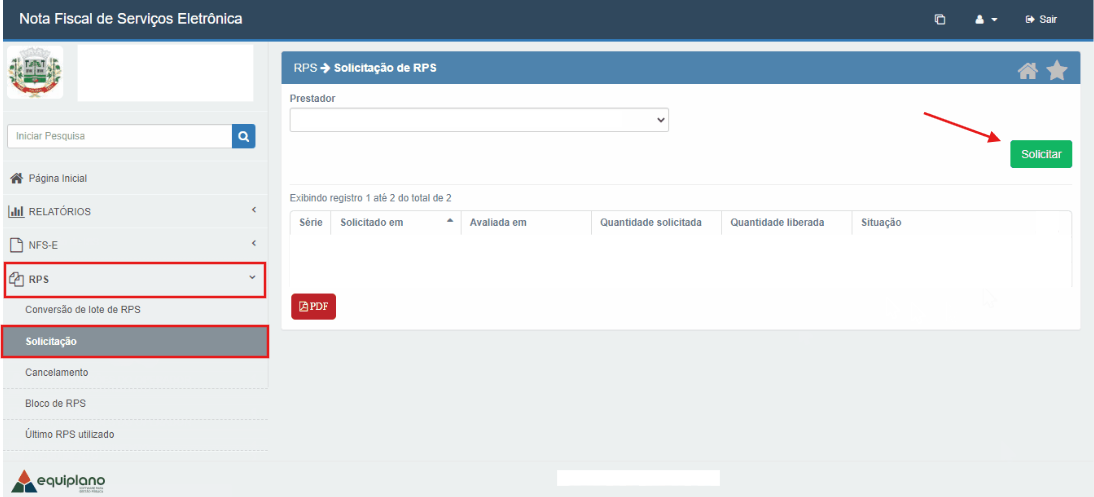 No portal da prefeitura, após realizar o login, acesse o menu RPS > Solicitação > Solicitar.
