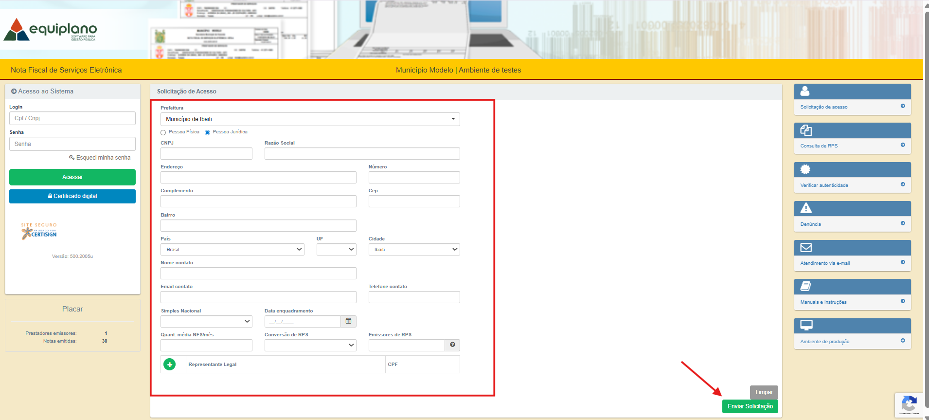 Primeiro será necessário fazer o cadastro em ambiente de Teste (homologação) no site Solicitação de Acesso - NFS-e - Equiplano, após acessar Selecione a prefeitura do seu município > Preencha as informações da sua empresa > E Clique em Enviar Solicitação.
