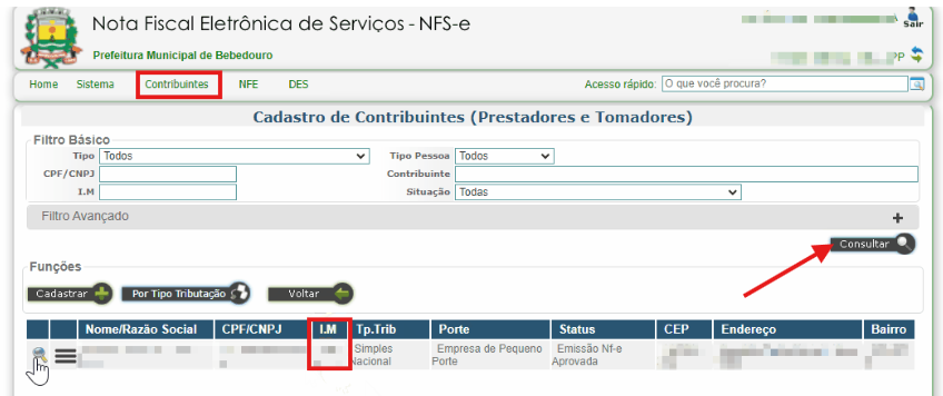 No portal da prefeitura, após fazer login, acesse Contribuintes > Cadastro de Contribuintes > Consultar. Nessa tela não aplique nenhum filtro e serão apresentados os dados da sua empresa, localize o campo I.M.