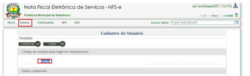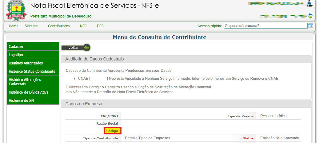 Para obter a informação do usuário, você deverá acessar a prefeitura e ir em Contribuintes > Cadastro de Contribuintes > Consultar. Nessa tela não aplique nenhum filtro e serão apresentados os dados da sua empresa, clique no ícone de lupa para acessar mais dados, em Código, terá a informação que será preenchida no campo Usuário.