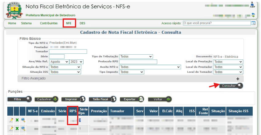 Pelo portal da prefeitura em NFE > Emissão / Consulta de NFS-e, na próxima tela clique em Filtro > Consultar, então localize a coluna RPS.