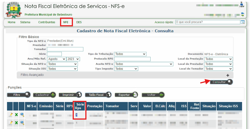 O número de série pode ser encontrado na última nota fiscal emitida, ou pelo portal da prefeitura em NFE > Emissão / Consulta de NFS-e, na próxima tela clique em Filtro > Consultar, então localize a coluna Série Rps.
