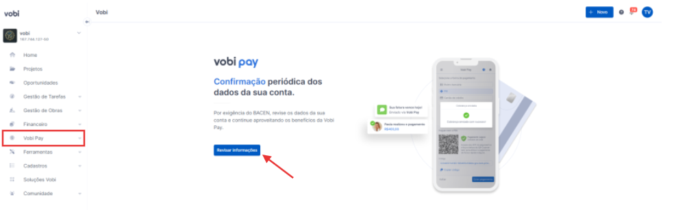 Dentro da plataforma Vobi, acesse a aba Vobi Pay pelo menu lateral direito. Em seguida, clique no botão “Revisar informações”.