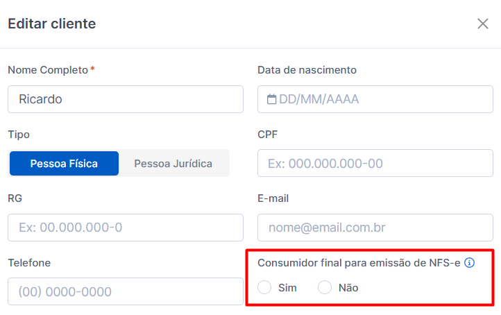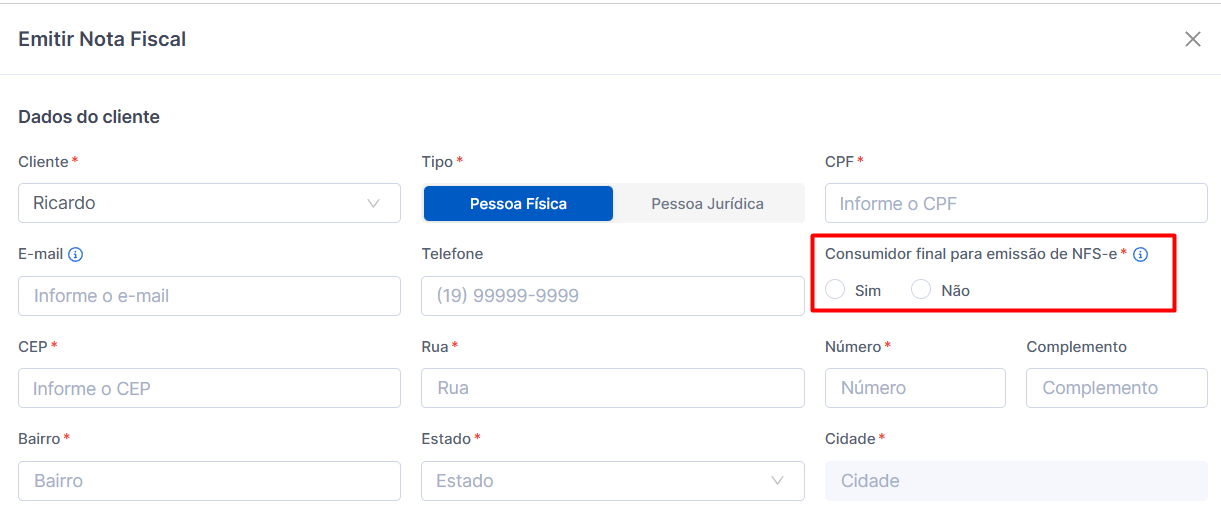 3- Selecione se ele é um consumidor final ou não para o seu serviço