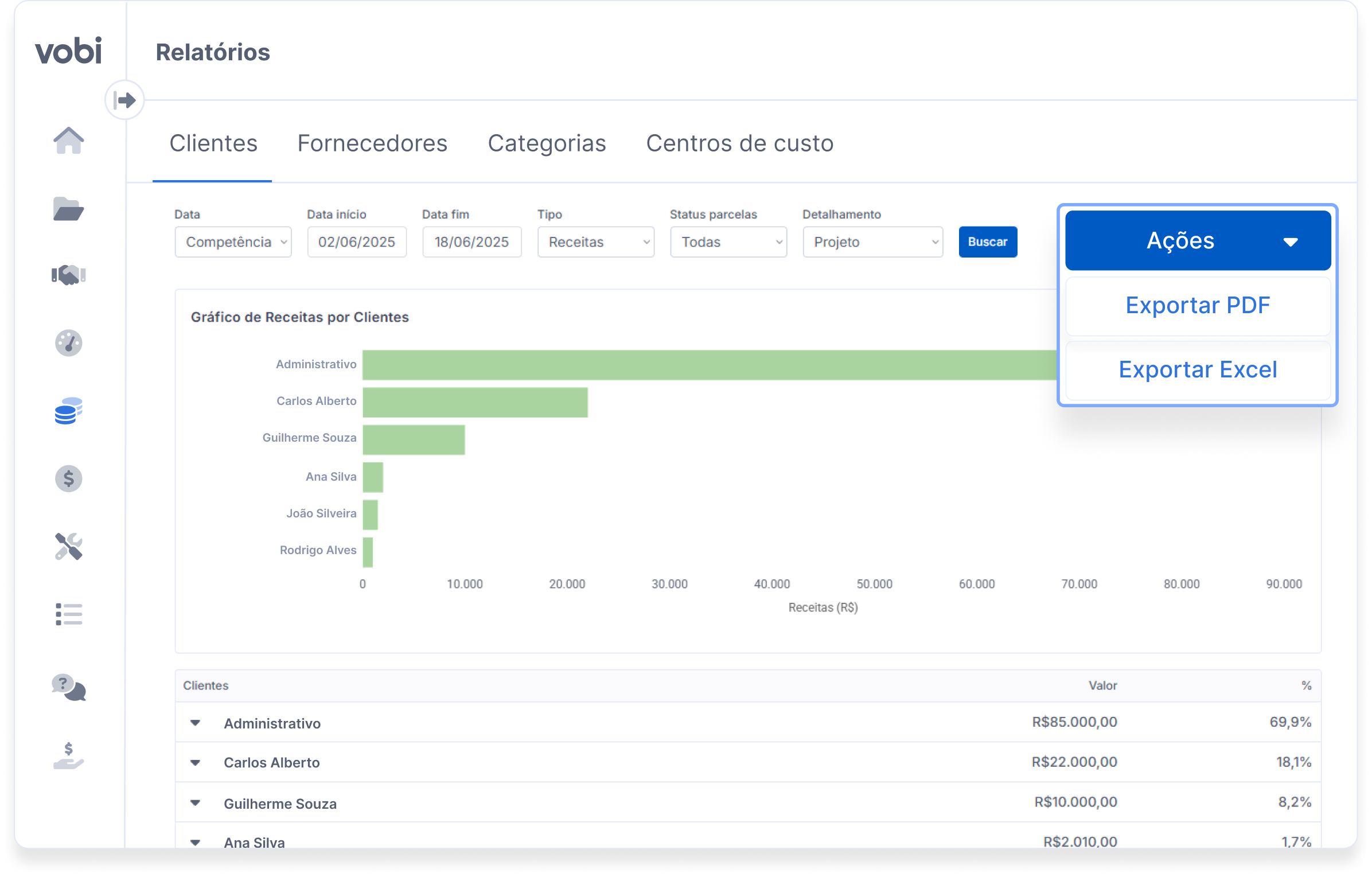 3. Exportação de relatórios (PDF e Excel)Exporte os Relatórios Financeiros de Resultados por Clientes, Fornecedores, Categorias e Centro de Custo em PDF ou Excel!