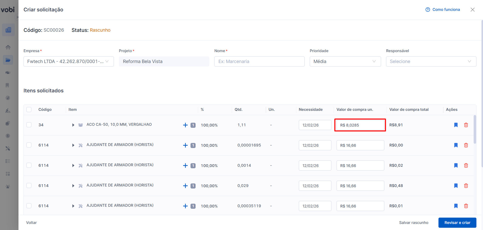 Essa novidade busca facilitar a sua conciliação com nota fiscal e valores reais de fornecedores, sobretudo as compras por tonelada/ferragem e outros cenários com valores unitários muito fracionados.