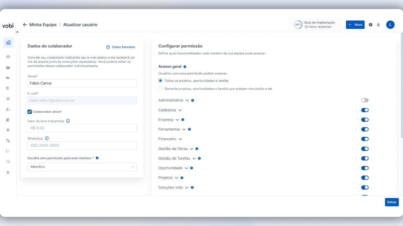 Com isso, se você é o administrador de uma conta na Vobi, você poderá conceder permissão de Gestão de Obras por projeto ou geral da empresa para um colaborador.