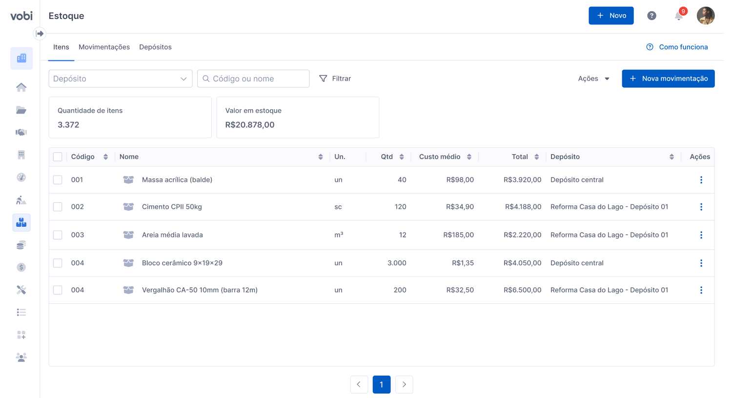 O módulo de Estoque da Vobi ajuda você a controlar materiais entre o escritório e as obras, com rastreabilidade do que entrou, do que foi consumido e do que foi transferido. Na prática, ele serve para evitar compras duplicadas, reduzir desperdício e dar clareza sobre onde está o material e quanto ainda existe disponível em cada obra.