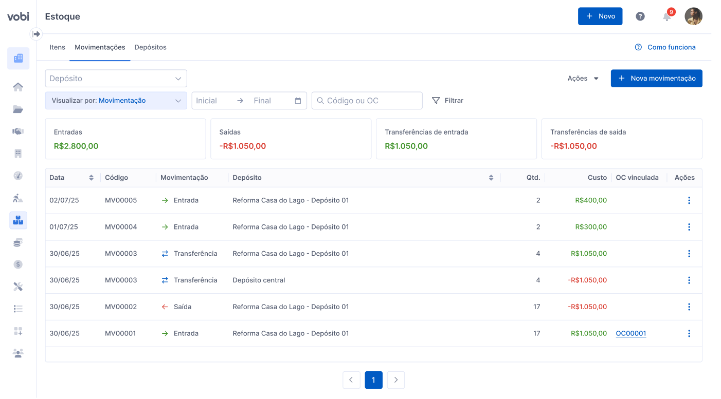 Aqui está o histórico completo do que aconteceu: entradas, saídas e transferências, com filtros para encontrar rapidamente uma movimentação por data, item, depósito, fornecedor, projeto e outros critérios.
